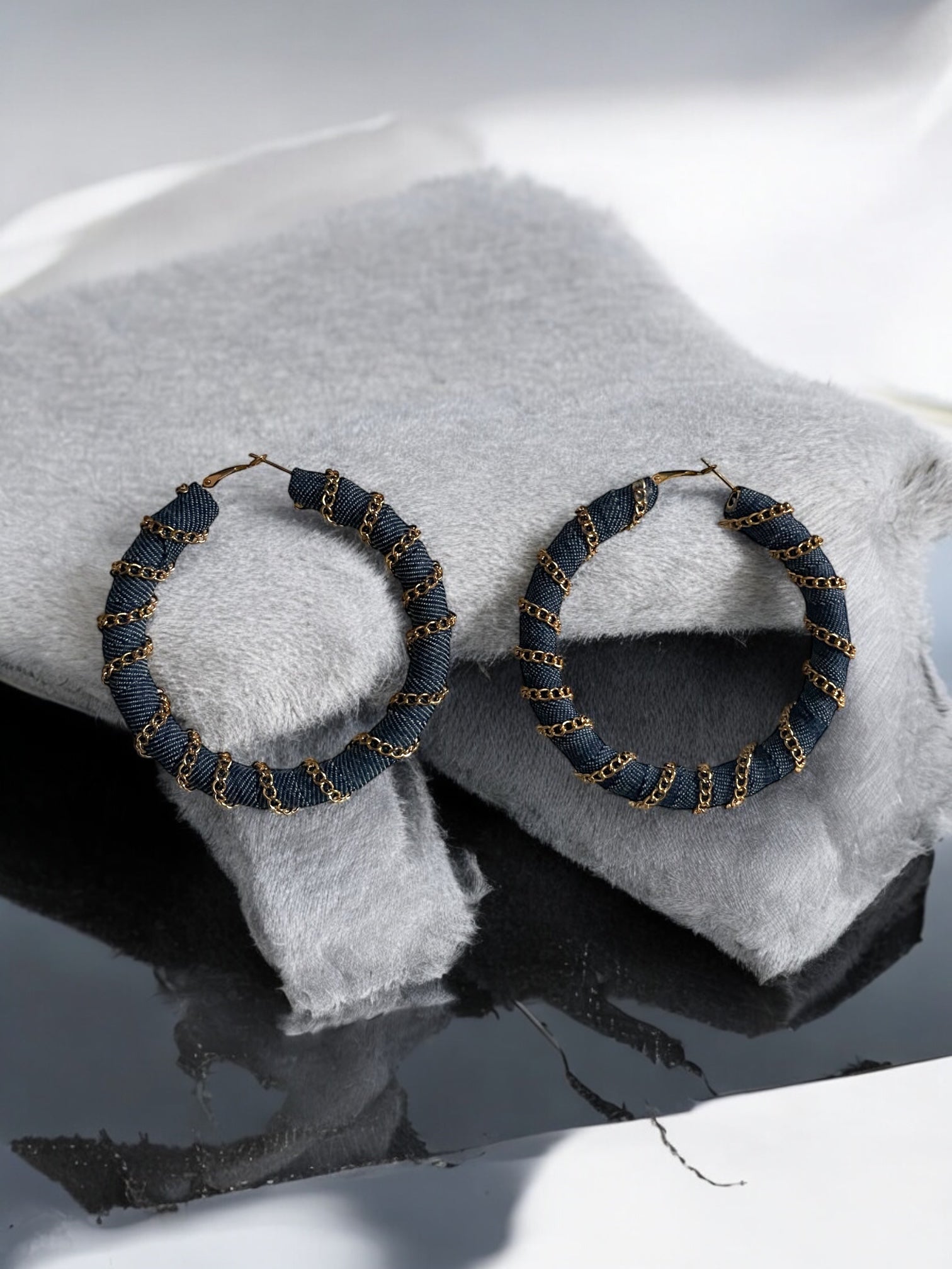 These oversized hoop earrings are wrapped in deep indigo denim and accented with delicate gold-tone chains for that street-chic vibe that stands out.